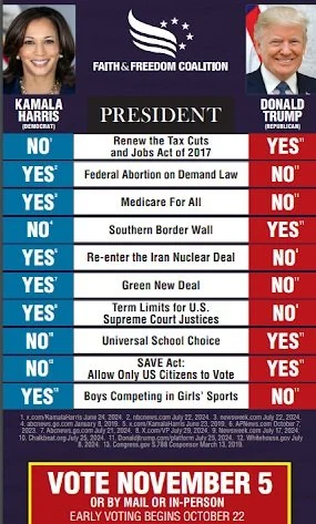 Please see the image to the left for the Faith & Freedom Coalition’s educational voter guide for the office of President for the 2024 General Election.